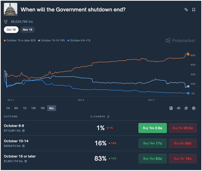Individuals can place a bet on whether the government shutdown will end during a certain window. Let’s take the first date range, “October 6-9,” a window that we are currently in.