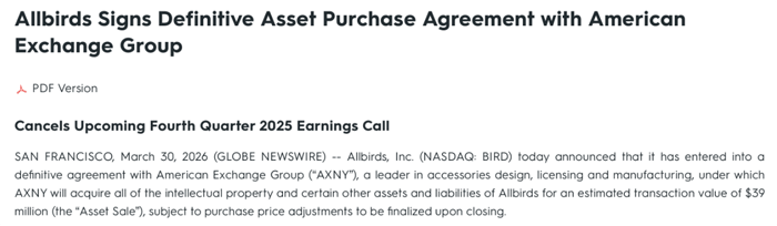 Just a couple of weeks ago, on March 30, Allbirds announced that it had entered into an agreement to basically sell its “sustainable” sneaker business for just $39 million to American Exchange Group.
