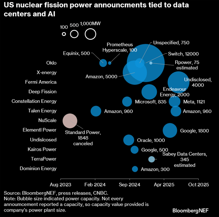 Below is an infographic comparing the size of America’s largest nuclear fission power plants with the planned generation capacity for AI data centers.