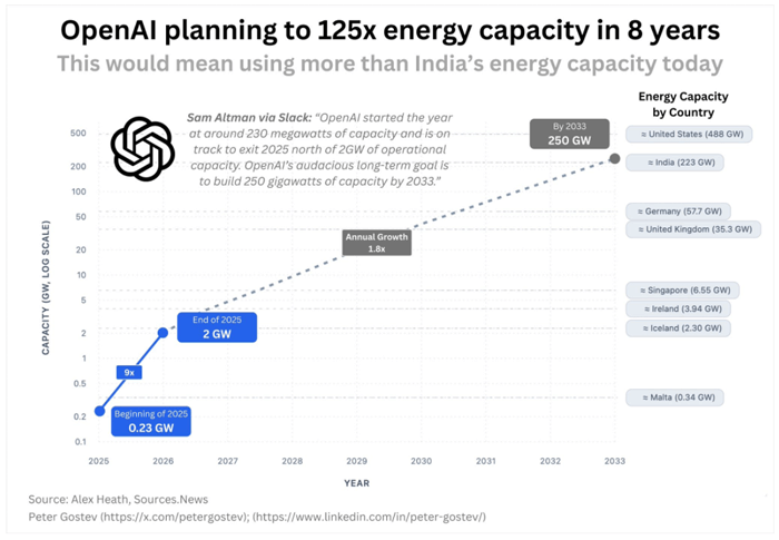 Sam Altman recently shared in an internal OpenAI Slack channel that he expects OpenAI will require nearly 250 GW of new electricity demand by 2033.