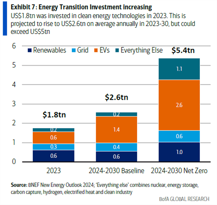 The bank’s long-term outlook projects between $181 and $215 trillion in total global energy investment over the next 26 years. And as the chart below shows, annual investment in clean energy tech will soar from the 2023 level.