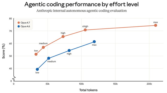 It also indicated that Opus 4.7 is even better at accomplishing real-world tasks, as evidenced in the chart below showing the improved performance of its agentic coding by computational effort.