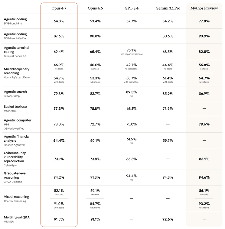 The Mythos Preview benchmark scores are not only notably higher than Opus 4.7 in all categories, but they are also significantly higher than OpenAI’s GPT 5.4 – in all but one category.