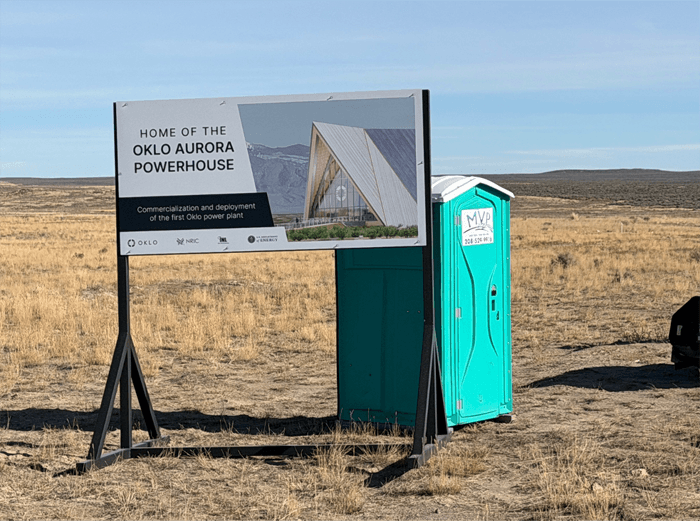 The project sign proclaimed the “Home of the Oklo Aurora Powerhouse”… with a bright turquoise porta-potty right behind it.