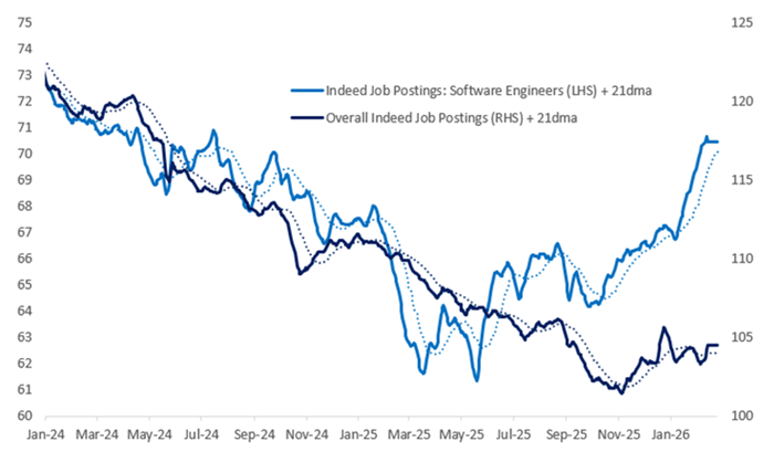 One notable point was that the number of postings for software engineers has significantly increased over the last six months, the opposite of what we might expect from the employment of AI and the expectation of layoffs of software engineers.