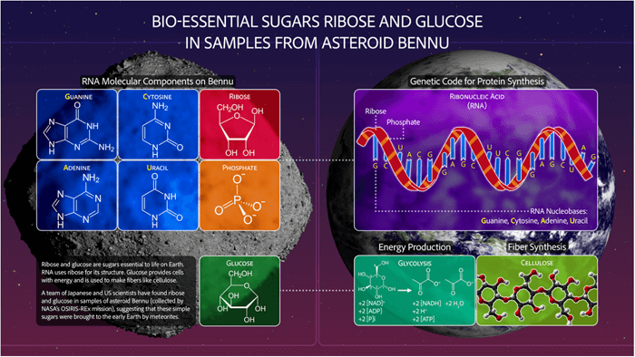 Ribose and glucose were the two missing elements for life from the previous analysis of the Bennu samples. In previous research, the scientists had already found four key nucleobases, namely guanine, cytosine, adenine, uracil, as well as phosphate. This latest discovery added ribose and glucose.