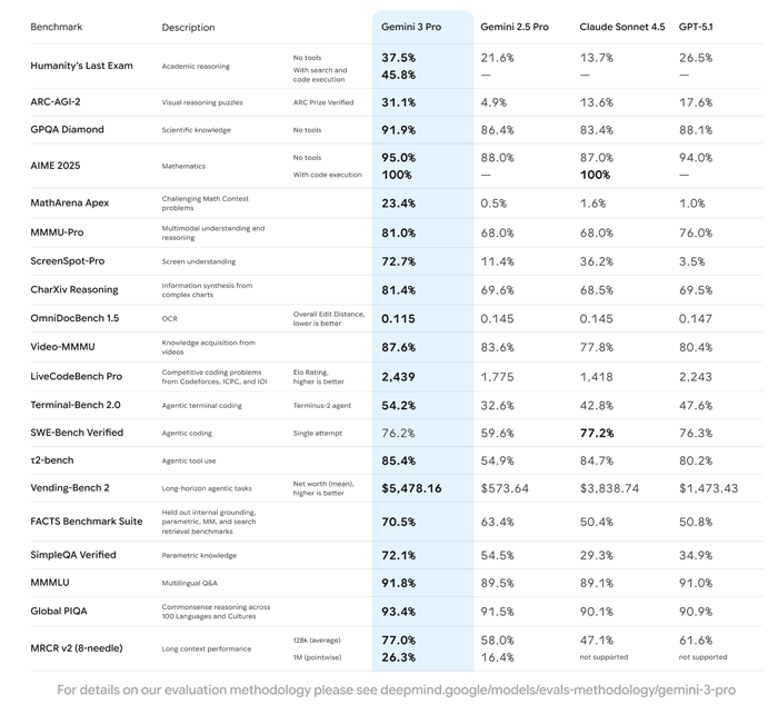 Gemini 3 Benchmarks for Most Common AI Tests | Source: Google