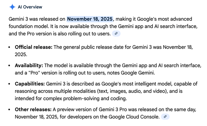 Gemini 3 is impressive, and it is already incorporated into Google’s search results, which produce an “AI Overview” shown below as an example. I’m sure most will recognize this feature if you are still using Google.