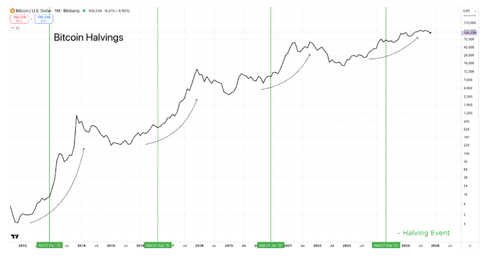 We can see these halving dates – and subsequent price action surrounding these dates – in the chart below.