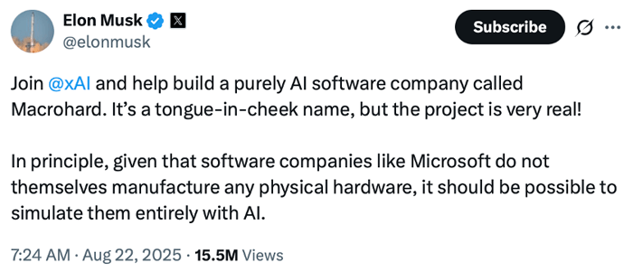 And when we pair a general intelligence frontier model like Grok with a self-evolving software company like Macrohard, we have technology that will radically change our workflow processes.