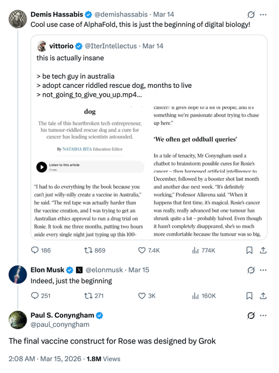 While he started his journey with ChatGPT and leveraged the protein structure work at DeepMind, it was xAI’s Grok that created the cancer therapy.