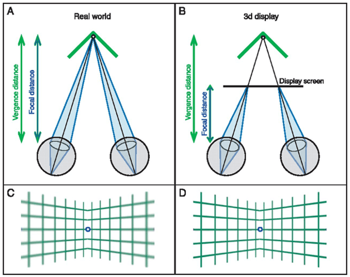 This is the “conflict” caused by vergence-accommodation differences. It can be discomforting, cause fatigue, and even make us feel like we want to puke.
