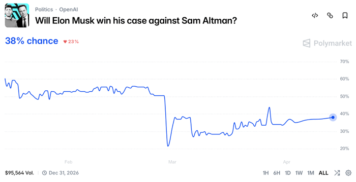 The latest Polymarket stats say Musk has only a 38% chance, reflecting more of the media narrative that the jury will see this as a silly feud levied by a billionaire.