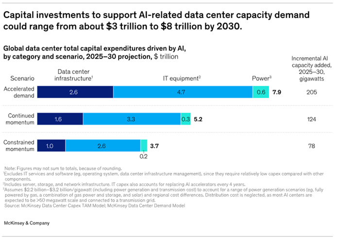 McKinsey estimates global investment in AI data centers could reach $5.2 trillion by 2030 under baseline assumptions.