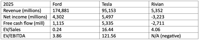 We can gain even more insights by comparing Ford, Tesla, and another EV-only company, Rivian (RIVN), by their financial metrics:
