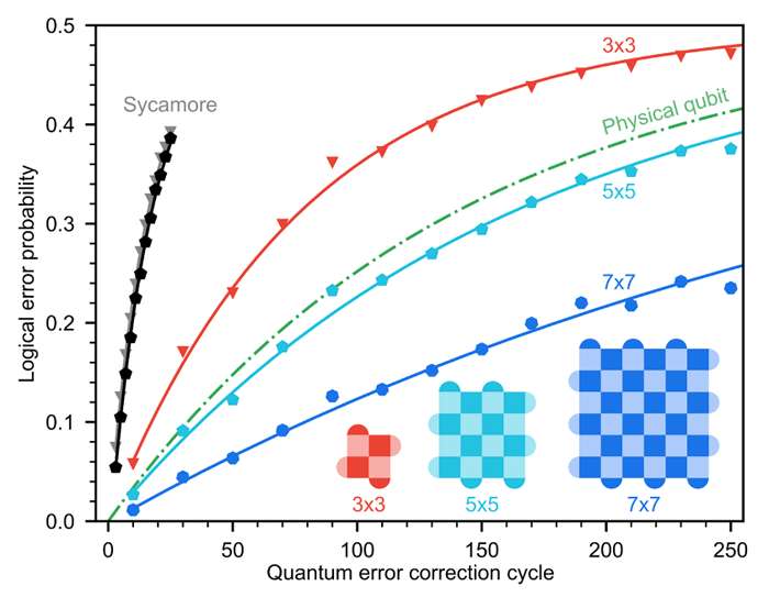 I know this is a technical subject, so the key point to understand is that Google’s error correction methodology demonstrated that by building larger quantum computing lattices – as shown above – it was able to correct more quantum errors.