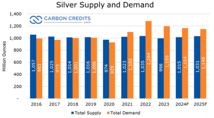 And in 2024, the market had a deficit of 149 million ounces. That’s about 15% of the total annual global supply.