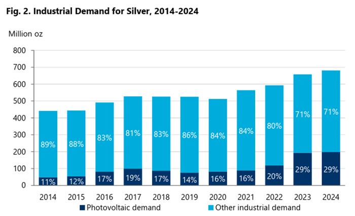 Over the past decade, solar power technology’s share of total industrial silver demand has grown from roughly 11% to nearly 29%. Over that same period, total silver demand has risen by about 50%.