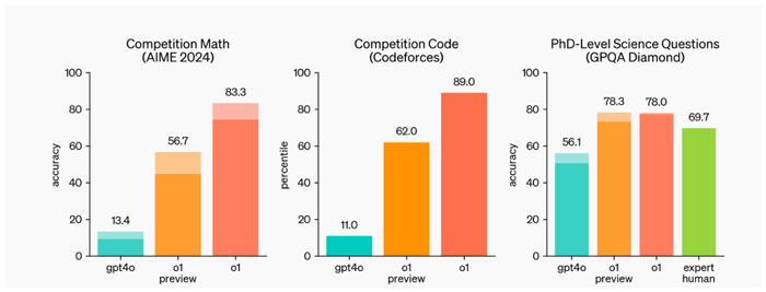 But just look at the performance in the chart on the right above! Both o1-preview and o1 were able to achieve 78% accuracy, higher than an expert human.