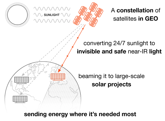 Overview Energy plans to launch a large constellation of solar power-generating satellites into geostationary Earth orbit (GEO)… and beam the power generated back down to Earth, directly to existing large-scale solar power projects.