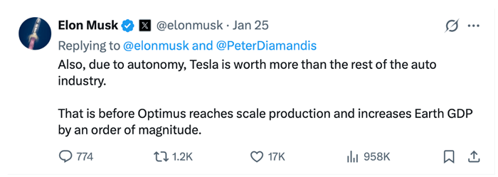 And it’s also why Optimus is going to be the most incredible electronics product the world has ever seen. A force multiplier for economic growth. A transformation of the world’s labor market.