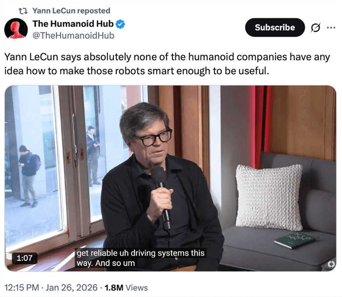 Even one of the godfathers of AI, Yann LeCun, an “expert,” very pointedly says that none of the humanoid companies “have any idea how to make those robots smart enough to be useful.” This was a very intentional, targeted criticism directed at Musk.