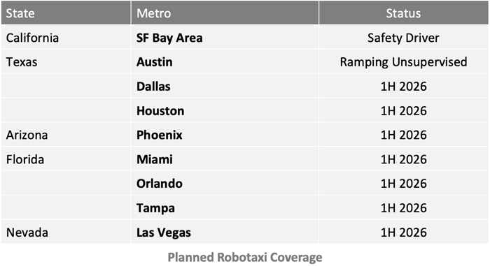 Soon, Tesla will be able to remove safety drivers in the San Francisco area, and it will expand to Dallas, Houston, Phoenix, Miami, Orlando, Tampa, and Las Vegas.