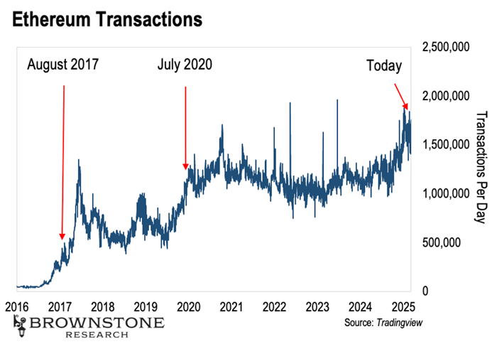 Here is a chart showing daily transactions over time for Ethereum. We highlighted two prior moments where transaction activity was surging well above its historic amounts.