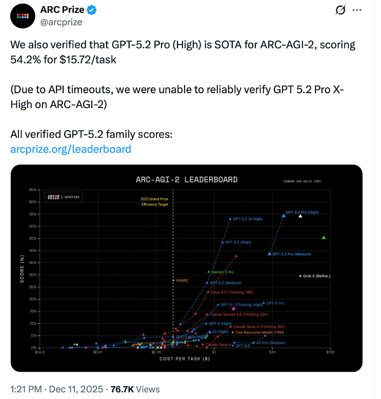 GPT-5.2 is now the first to achieve more than 50% on the test, overtaking Gemini 3 Pro and Grok 4 at just $15.72 per task.