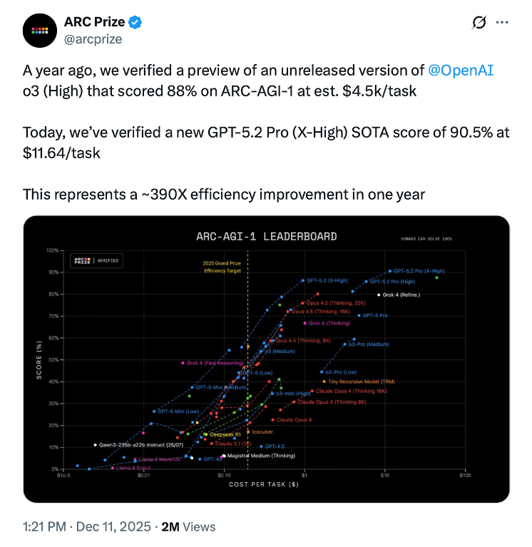That cost has declined from $4,500 per task to just $11.64 per task, now scoring 90.5% on the ARC-AGI-1 test. That represents a 390X improvement in efficiency. In a single year.