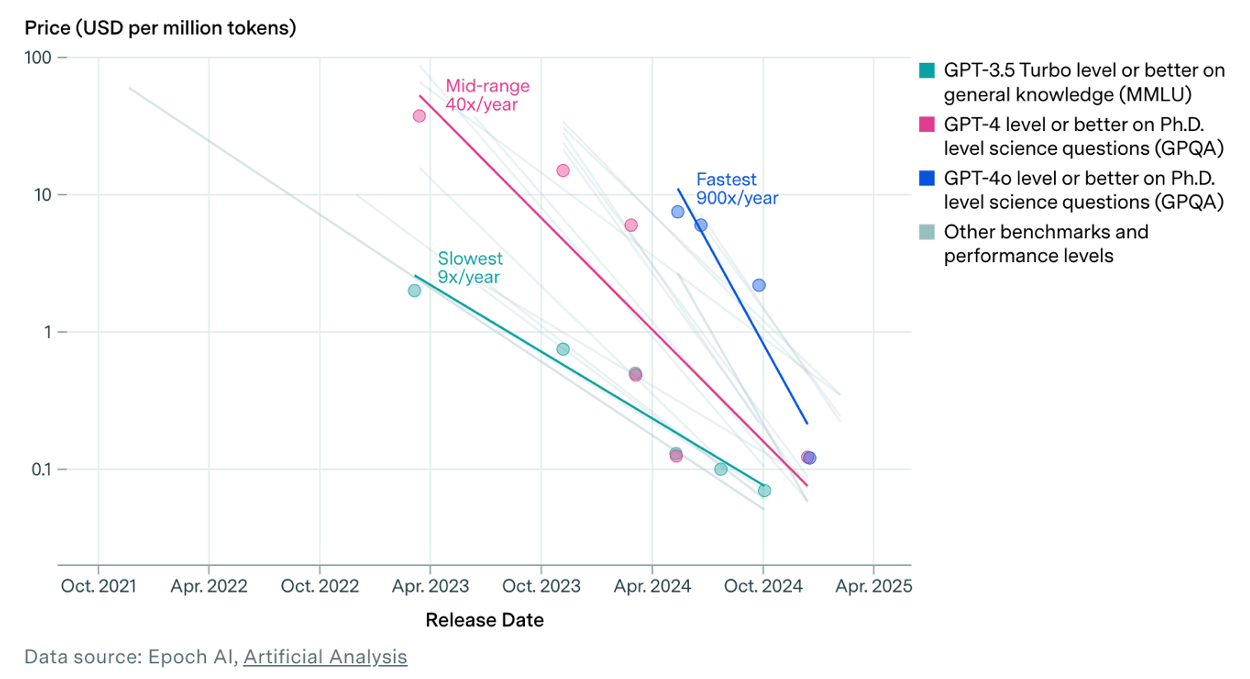 The chart below is even more dramatic, demonstrating the difference between an “older” frontier model like GPT-3.5 (in green) declining in cost by 9X a year, and the more advanced GPT-4o model declining at a precipitous 900X a year.