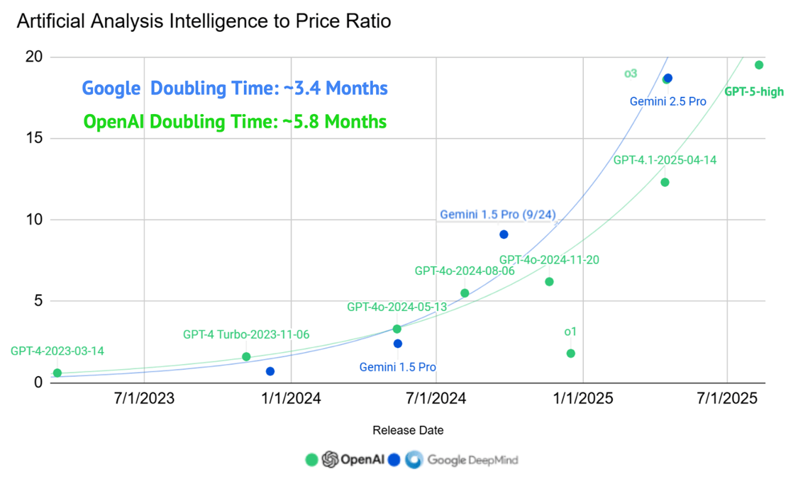 Shown below is an example of the “Intelligence-to-Price Ratio” of two prominent frontier AI models, OpenAI’s GPT and Google DeepMind’s Gemini.