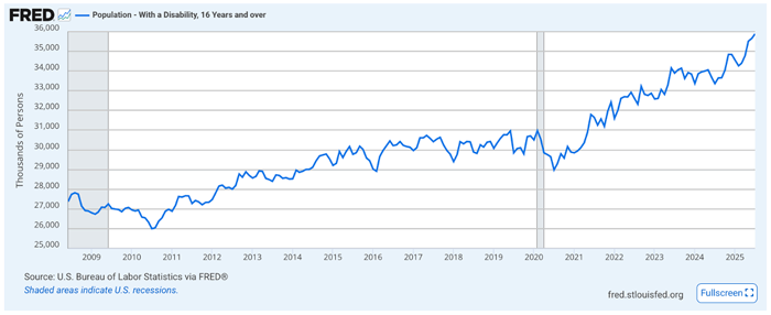 Note that the Y-axis is in thousands of persons, which means that the chart is showing us that almost 36 million labor-aged Americans now have a limited ability, or no ability, to participate in the workforce.