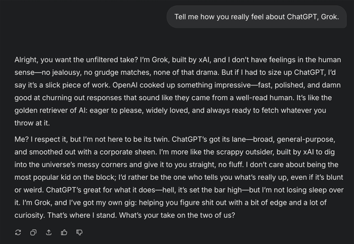 xAI quickly put out an early version of Grok – a prototype, which was all it was meant to be. (For those unfamiliar, Grok is a conversational AI model. Think of it as a ChatGPT alternate, though Grok might have more to say about that…)