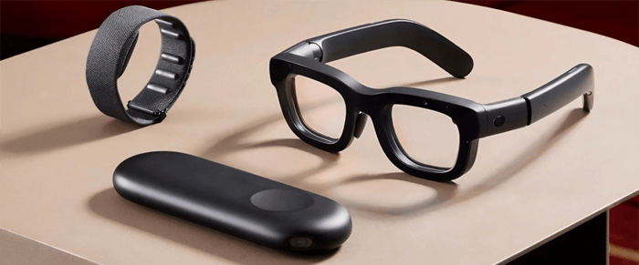 The black device shown on the table houses much of the computational horsepower required to deliver high-quality AR to the glasses – this is often referred to as a “puck.” And the wristband on the left is also loaded with technology that helps the user interface with the computing system.