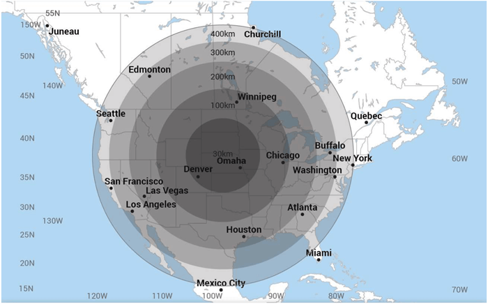 The higher the altitude, the larger the radius of the damage. As we can see above, at 400 km altitude, the impacted geographic area is large enough to cover almost all of the lower 48 states of the U.S. and most of populated Canada.