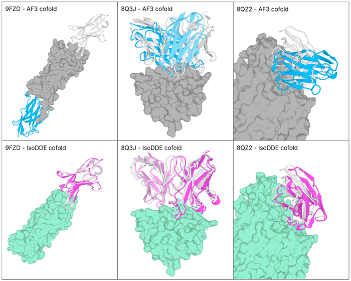 To more easily visualize the accuracy of IsoDDE, we can view the image below from Isomorphic’s research, which shows AlphaFold 3 predictions on the top row and the corresponding predictions made by IsoDDE for antibody-antigen structure predictions on the bottom row.