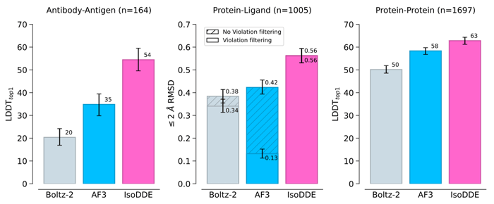 Shown below are the dramatic improvements in IsoDDE (in pink) compared to AlphaFold 3 (in blue). It excels in antibody-to-antigen, protein-to-ligand, and protein-to-protein predictions.
