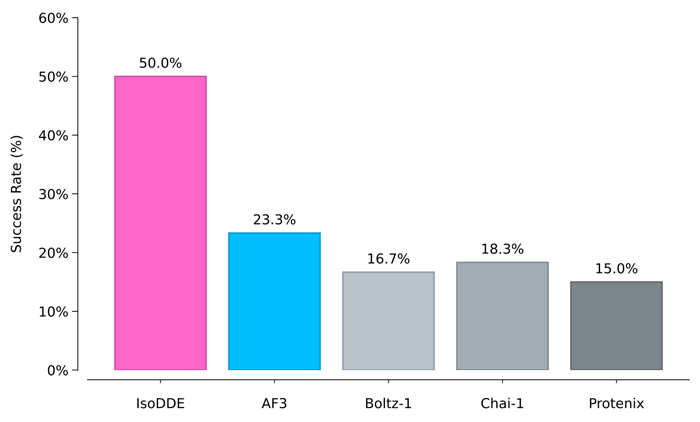 Shown below is a chart that shows how IsoDDE has more than doubled the accuracy compared to AlphaFold 3 (AF3) for the most difficult kinds of predictions.