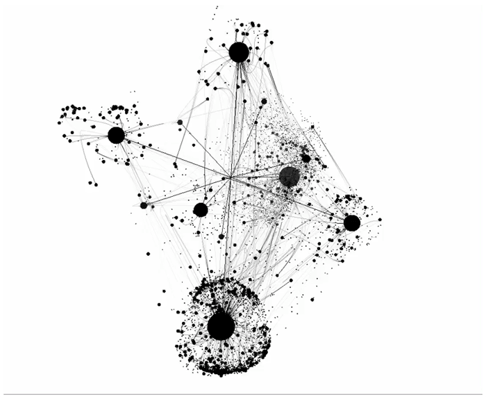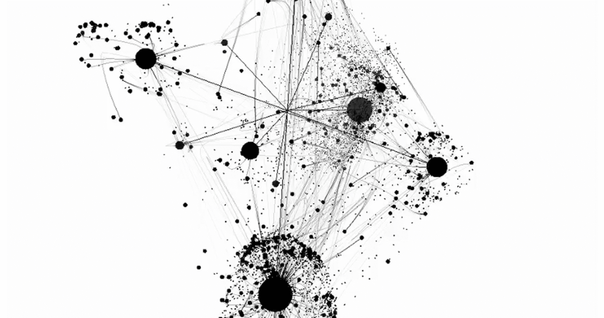 The small dots are agents. Each time one of those small bubbles moves from one large bubble to the next, it represents a transaction.